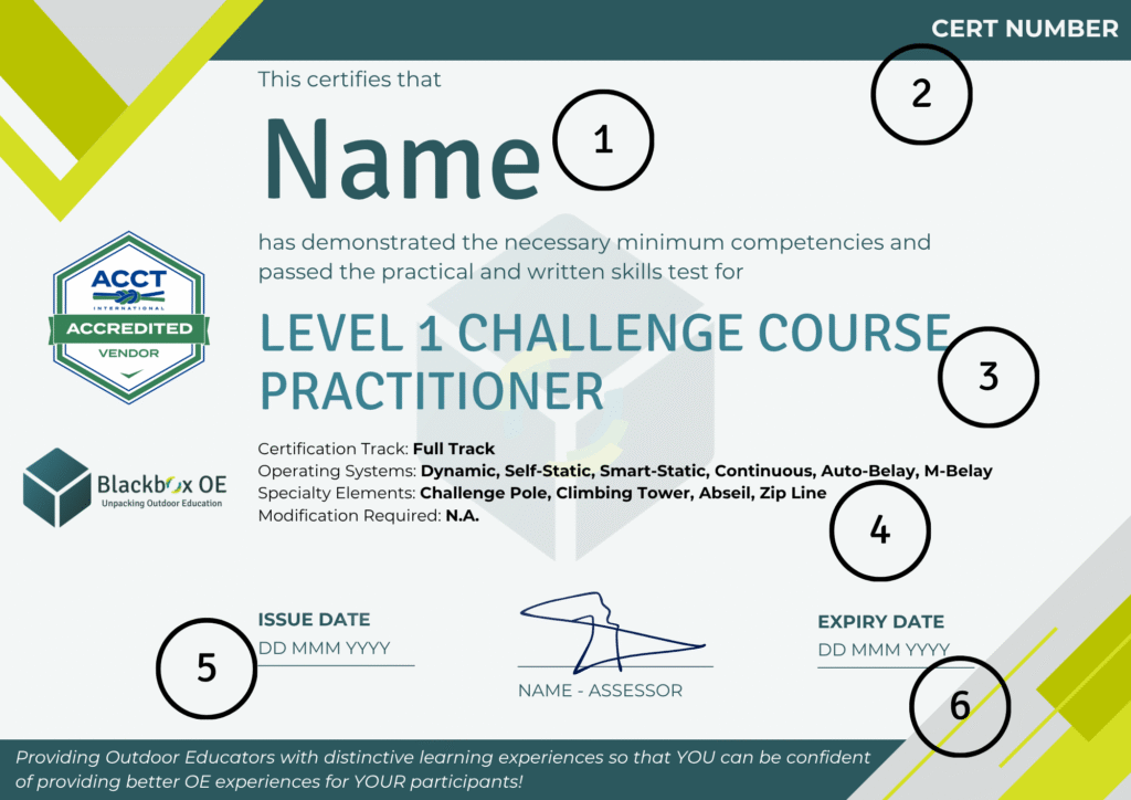 • A Full Track certificate indicates that the practitioner has been exposed to a variety of belay systems and has demonstrated the necessary Core, Technical and Facilitation competencies to operate at any site. However, he/she will have to be familiarised with the site before beginning operations.